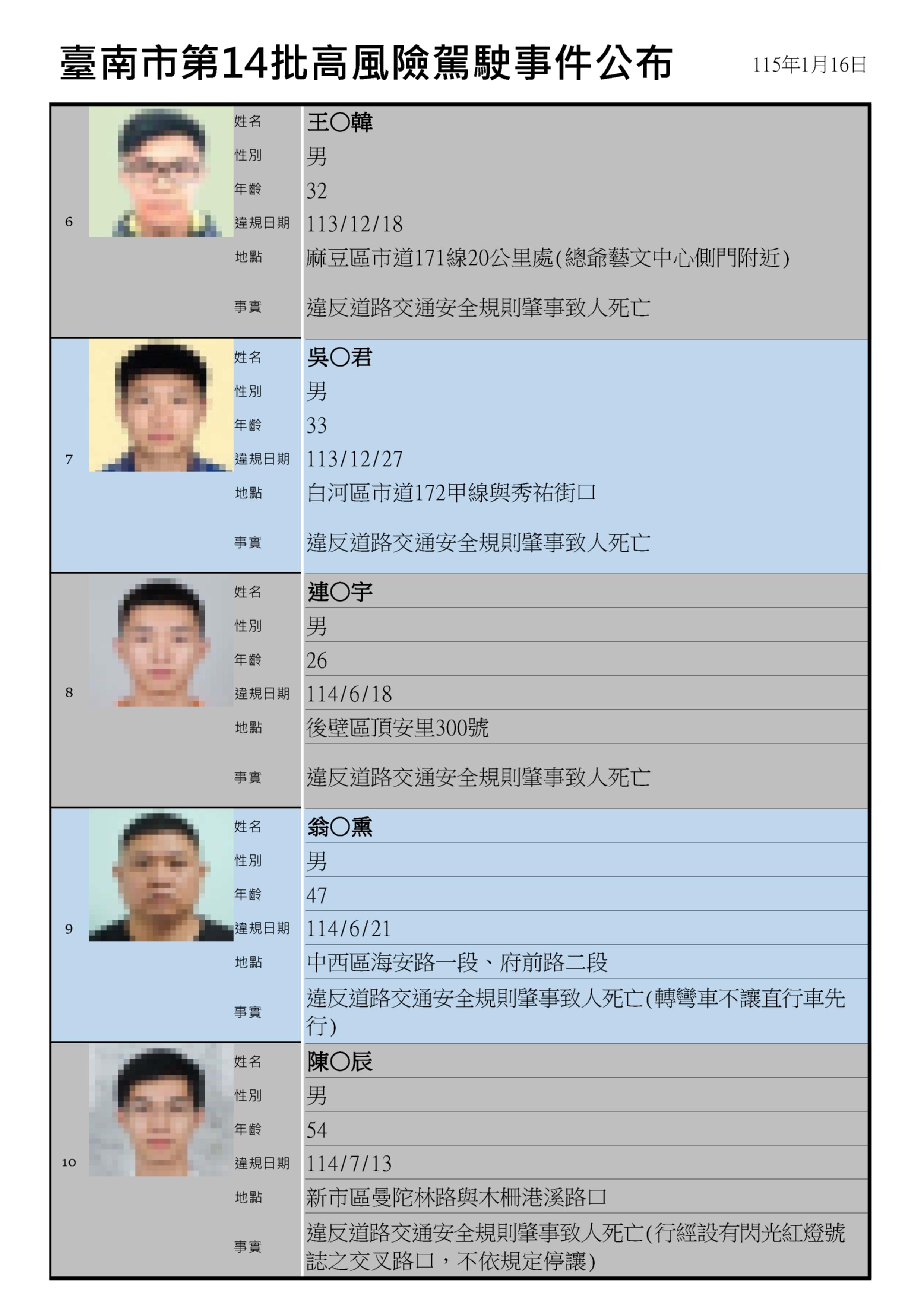 台南市政府交通局表示,台南市高風險駕駛事件資訊公開作業原則於112年8月11日公告施行,公告對象係就汽車駕駛人違反道路交通管理處罰條例因而肇事致人重傷或死亡者,或有其他受社會矚目的交通違規事件;於裁決處分完成後,依照公開作業原則將相關資訊去識別化,公布在交通局網站「高風險駕駛事件公布專區」。