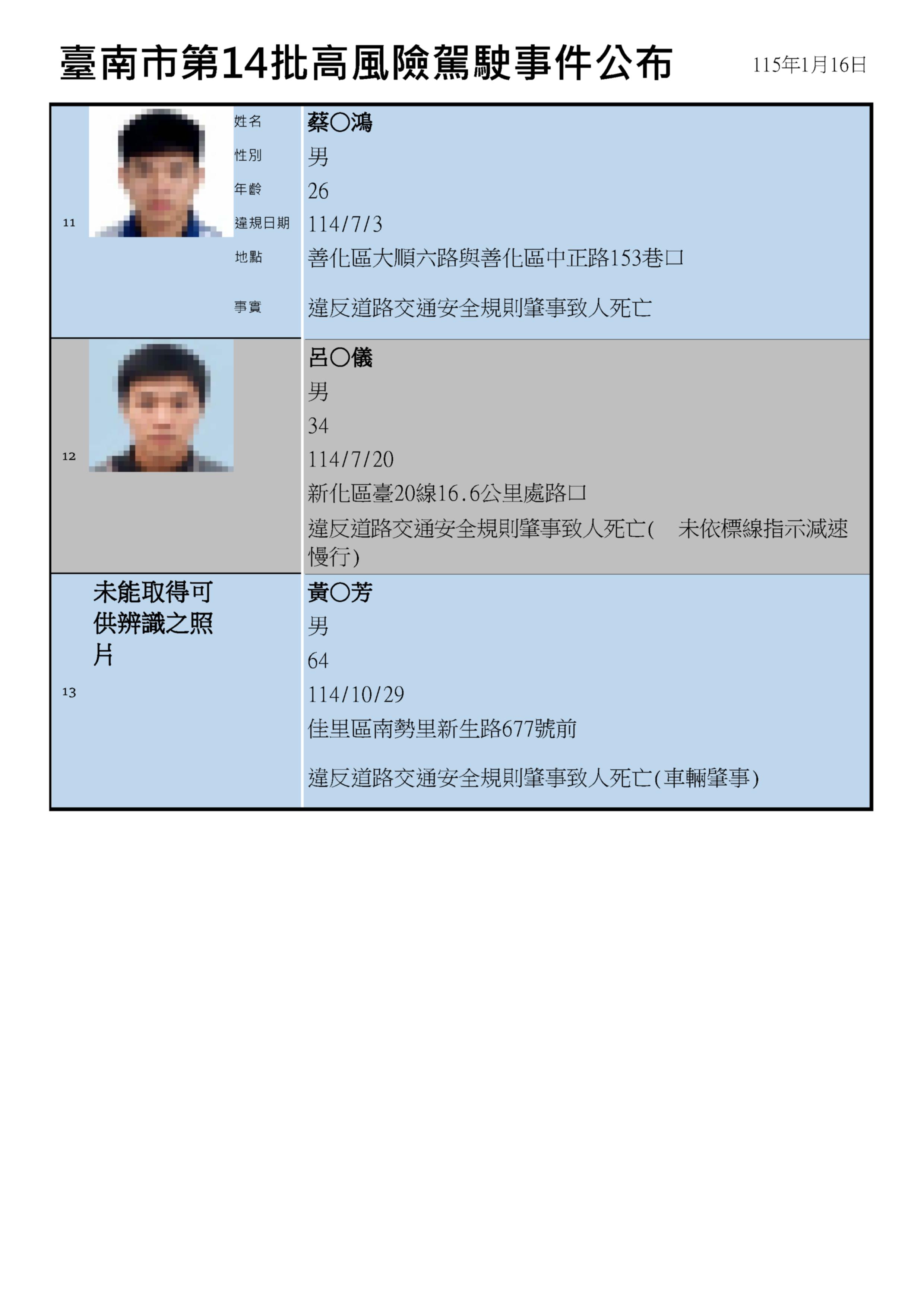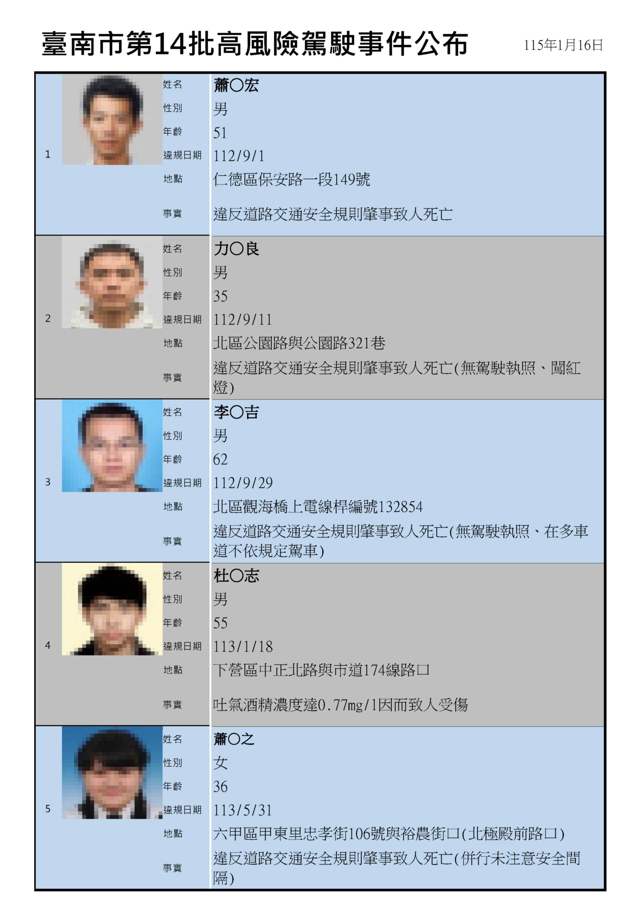 為提升交通安全友善空間,台南市制定高風險駕駛事件資訊公開作業原則,透過主動公開高風險駕駛事件資訊維護交通安全,公布第14批高風險駕駛名單共13人,其中有2人涉嫌無照駕駛肇事致人於死的駕駛人,交通局呼籲駕駛人除要避免高風險駕駛行為,也要保持防禦駕駛的觀念,才能確保行車用路安全。