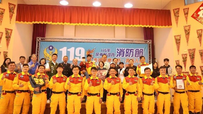 屏東縣政府今(19)日於消防局禮堂舉行「119消防節暨表揚大會」,公開表揚榮獲鳳凰獎、防火宣導菁英獎、績優消防人員、績優義消人員及績優災害防救團體,縣長周春米一一頒獎致意,肯定並感謝第一線消防與義消人員長期守護縣民生命財產安全的無私奉獻,同時勉勵獲獎人員持續精進專業、強化訓練,在消防、救災與救護工作上不斷突破,讓屏東鄉親能在更安全的環境中安心生活,朝向「零災害」的城市目標邁進。