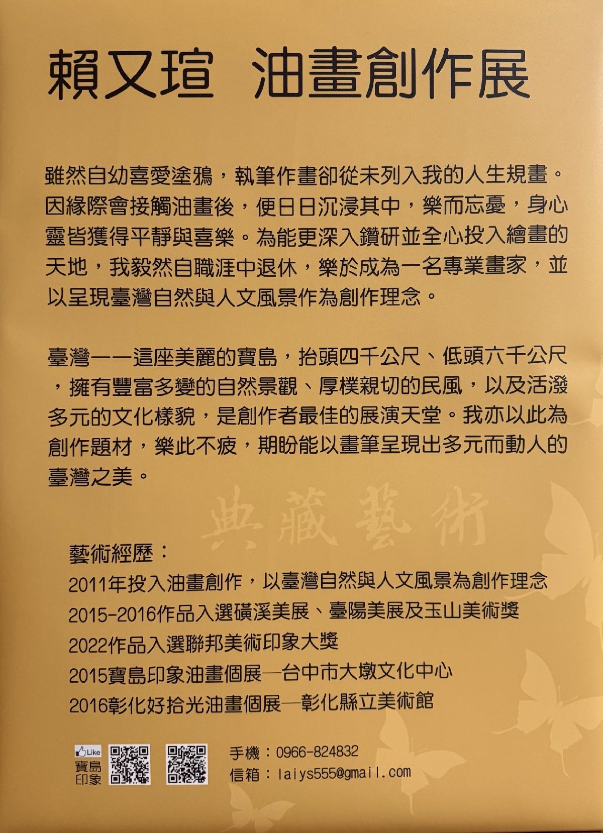 中山地政事務所表示,賴又瑄老師於3樓展出的油畫創作展,以油彩為主要媒材,長期關注台灣自然與人文景觀。畫家歷時一年走訪彰化各鄉鎮,以印象派筆觸描繪地方民俗、山水風貌與生活記憶,將懷鄉情感轉化為色彩與光影,呈現台灣土地樸實而動人的風景,引領觀者重溫屬於地方的溫暖時光。