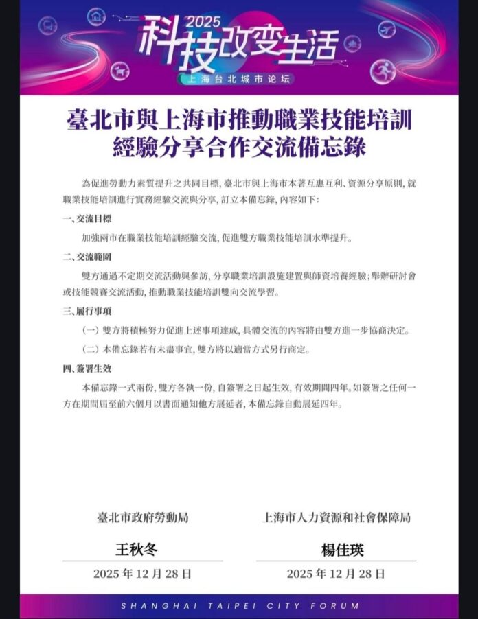 | 簽署合作備忘錄 臺北市與上海市推動水治理交流合作備忘錄 臺北市與上海市推動職業技能培訓經驗分享合作交流備忘錄 |