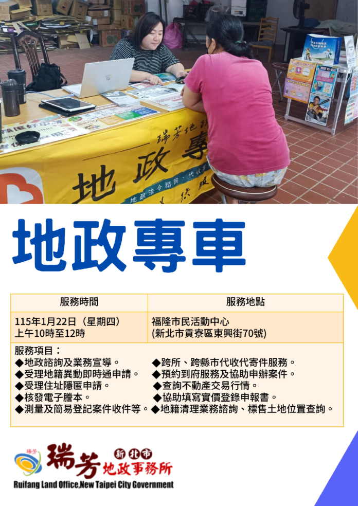 新北市瑞芳地政事務所「地政專車」行動服務即將出發為市民服務囉!本次地政專車服務訂於115年1月22日(星期四)上午 10 點至12點,於福隆市民活動中心(貢寮區東興街70號)辦理,歡迎地方鄉親及市民朋友踴躍前來參加,近距離體驗便捷又貼心的地政服務。