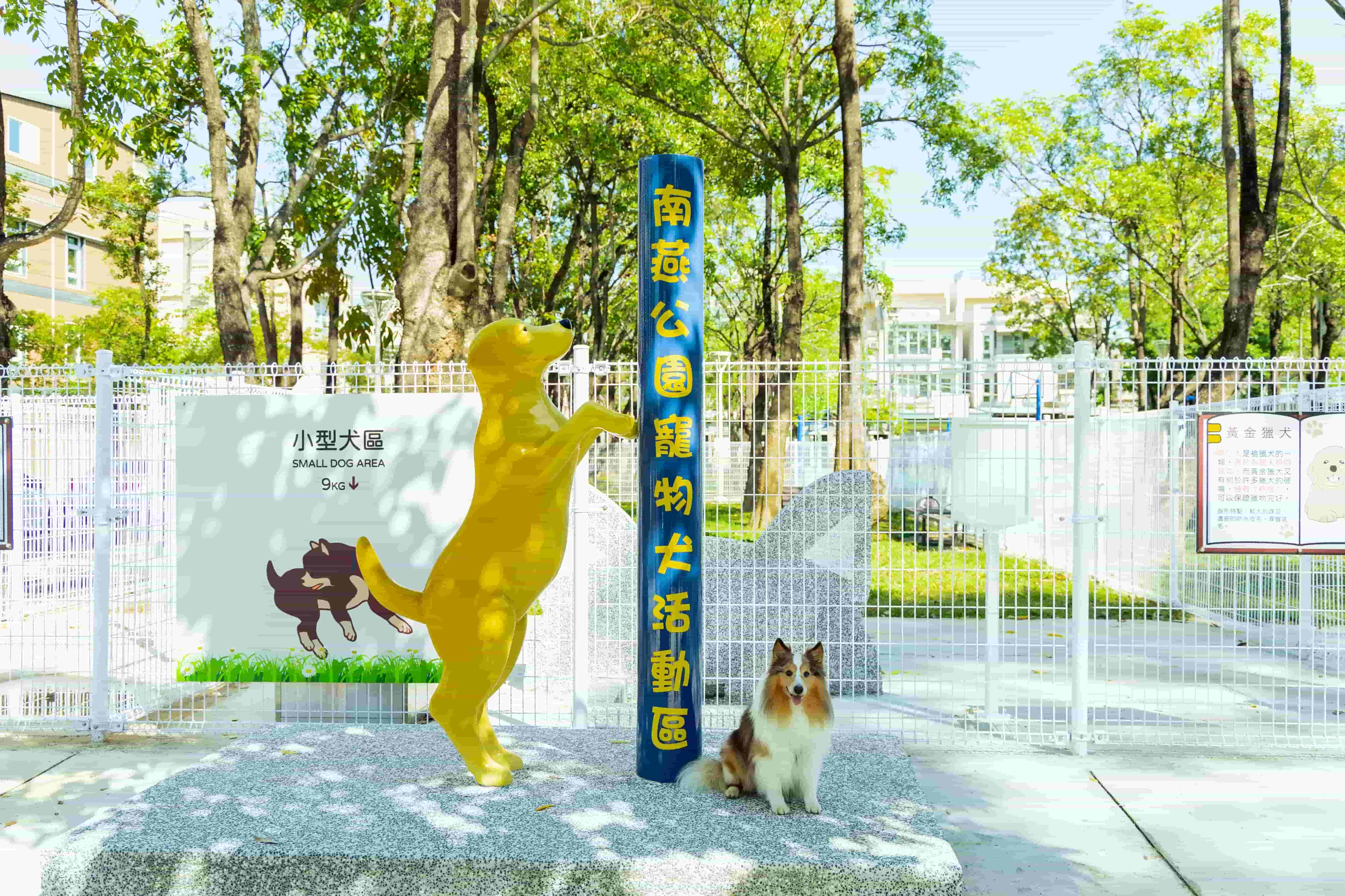 此外,各活動區均設置特色入口意象,結合代表犬種與在地故事,不僅成為場域識別,也吸引飼主拍照打卡。設施方面兼顧「安全、活動、服務」三面向,包含圍籬、雙層出入口、大小犬分區、草坪、遊憩設施、休憩座椅、飲水與清潔設備等,並設置告示牌進行守則、動保觀念及犬種科普宣導。部分場地更依需求加強遮蔭與照明,提升整體使用品質。