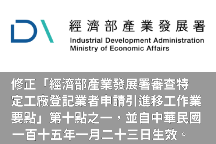 產經消費修正「經濟部產業發展署審查特定工廠登記業者申請引進移工作業要點」第十點之一,並自中華民國一百十五年一月二十三日生效。 產經消費 修正「經濟部產業發展署審查特定工廠登記業者申請引進移工作業要點」第十點之一,並自中華民國一百十五年一月二十三日生效。 編輯 江 秉鈞 2026-01-20 附修正「經濟部產業發展署審查特定工廠登記業者申請引進移工作業要點」第十點之一 Tags經濟部產業發展署 延伸閱讀 商情 總興實業深耕60年食品機械,第三代接班開啟全球布局 商情 旺德富工程行-台北新北廢棄物清運、新北裝潢廢棄物清運 商情 不只是健身而已!這間板橋格鬥館讓你學會如何保護自己! 商情 桃園崧宇廣告專業LED招牌工程打造北部地區吸睛店面