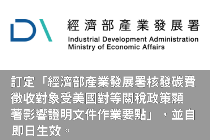 產經消費訂定「經濟部產業發展署核發碳費徵收對象受美國對等關稅政策顯著影響證明文件作業要點」,並自即日生效。 產經消費 訂定「經濟部產業發展署核發碳費徵收對象受美國對等關稅政策顯著影響證明文件作業要點」,並自即日生效。 編輯 江 秉鈞 2026-01-20 附「經濟部產業發展署核發碳費徵收對象受美國對等關稅政策顯著影響證明文件作業要點」 Tags經濟部產業發展署 延伸閱讀 商情 總興實業深耕60年食品機械,第三代接班開啟全球布局 商情 旺德富工程行-台北新北廢棄物清運、新北裝潢廢棄物清運 商情 不只是健身而已!這間板橋格鬥館讓你學會如何保護自己! 商情 桃園崧宇廣告專業LED招牌工程打造北部地區吸睛店面