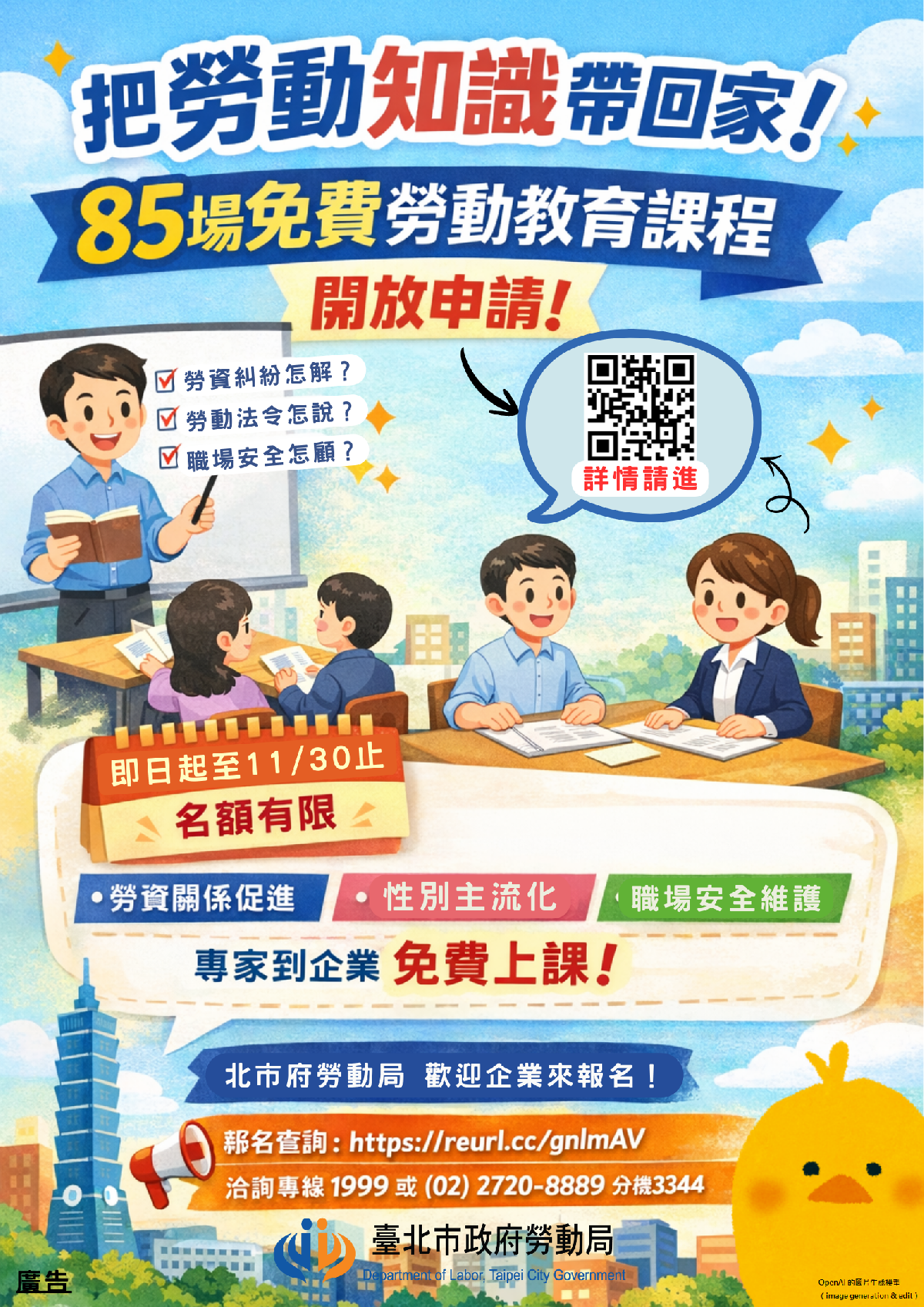 臺北市政府勞動局持續推出「赴事業單位勞動教育課程」,邀請專業講師直接走進企業,面對面分享實用又重要的勞動法令知識。只要您的事業單位適用《勞動基準法》並設立於臺北市,就能免費申請。申請期間自即日起至115年11月30日止,名額有限,額滿為止。