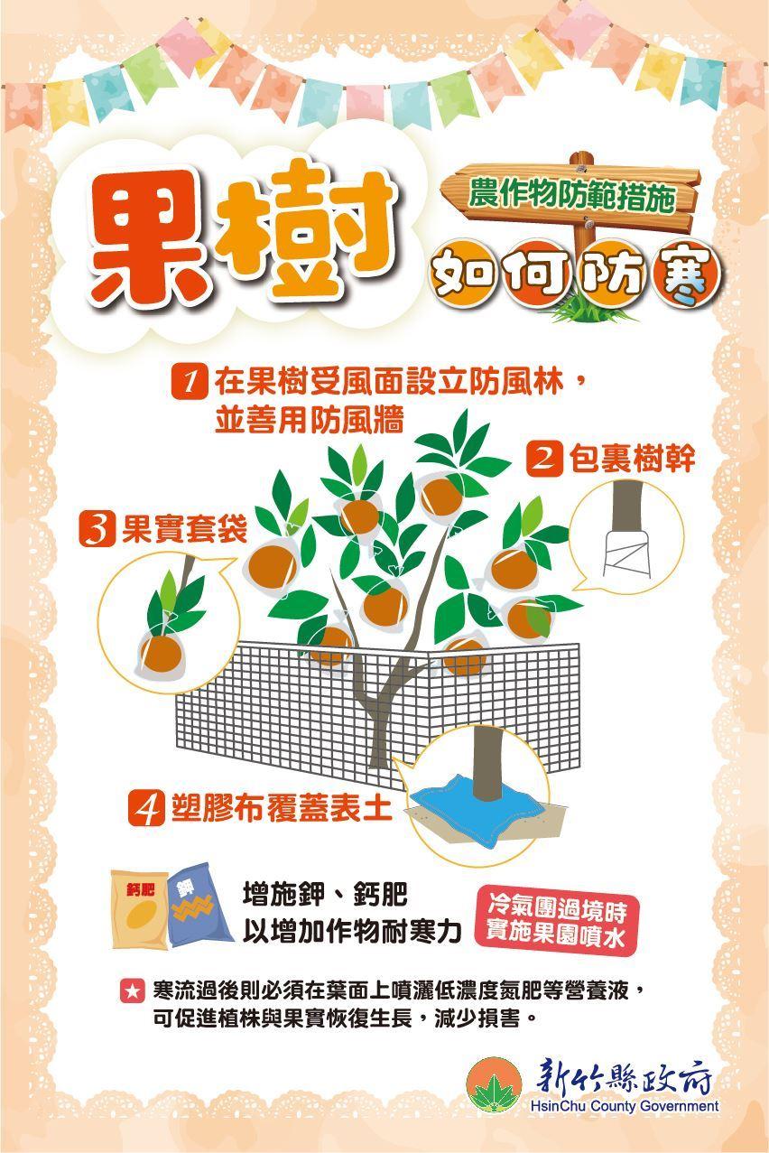 四、果樹部分應加強果實套袋及表土覆蓋等防寒設施,冷氣團過境時,正值開花期水果實施果園噴水或增施鉀肥,以增加作物耐寒力。剛嫁接的高接梨穗易受寒害,開花遇雨水影響授粉,更應留意氣溫狀況妥適防護,可以於嫁接或開花行人工授粉後套上塑膠袋以防寒風,提高嫁接穗的存活率與著果率;已屆採收期之果園宜加速採收,尤其柑橘更須留意,以減少損失。若有受害之果樹,應行修剪受害枝條與葉片及疏花、疏果措施。