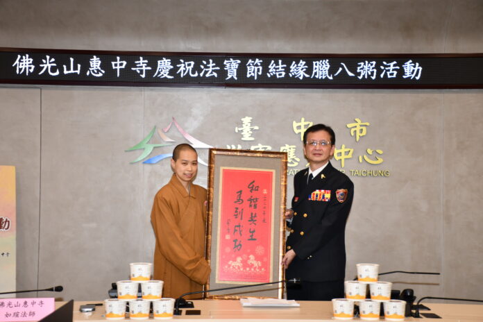 農曆十二月初八為佛陀成道日,佛光山惠中寺副住持如瑄法師今(21)日前往台中市政府消防局舉辦贈粥儀式,致贈消防人員臘八粥,並致送星雲大師墨寶春聯「和諧共生、馬到成功」。由消防局副局長楊元吉代表受贈,並回贈感謝狀及紀念品,雙方在溫馨莊嚴的氛圍中互道祝福與感謝。