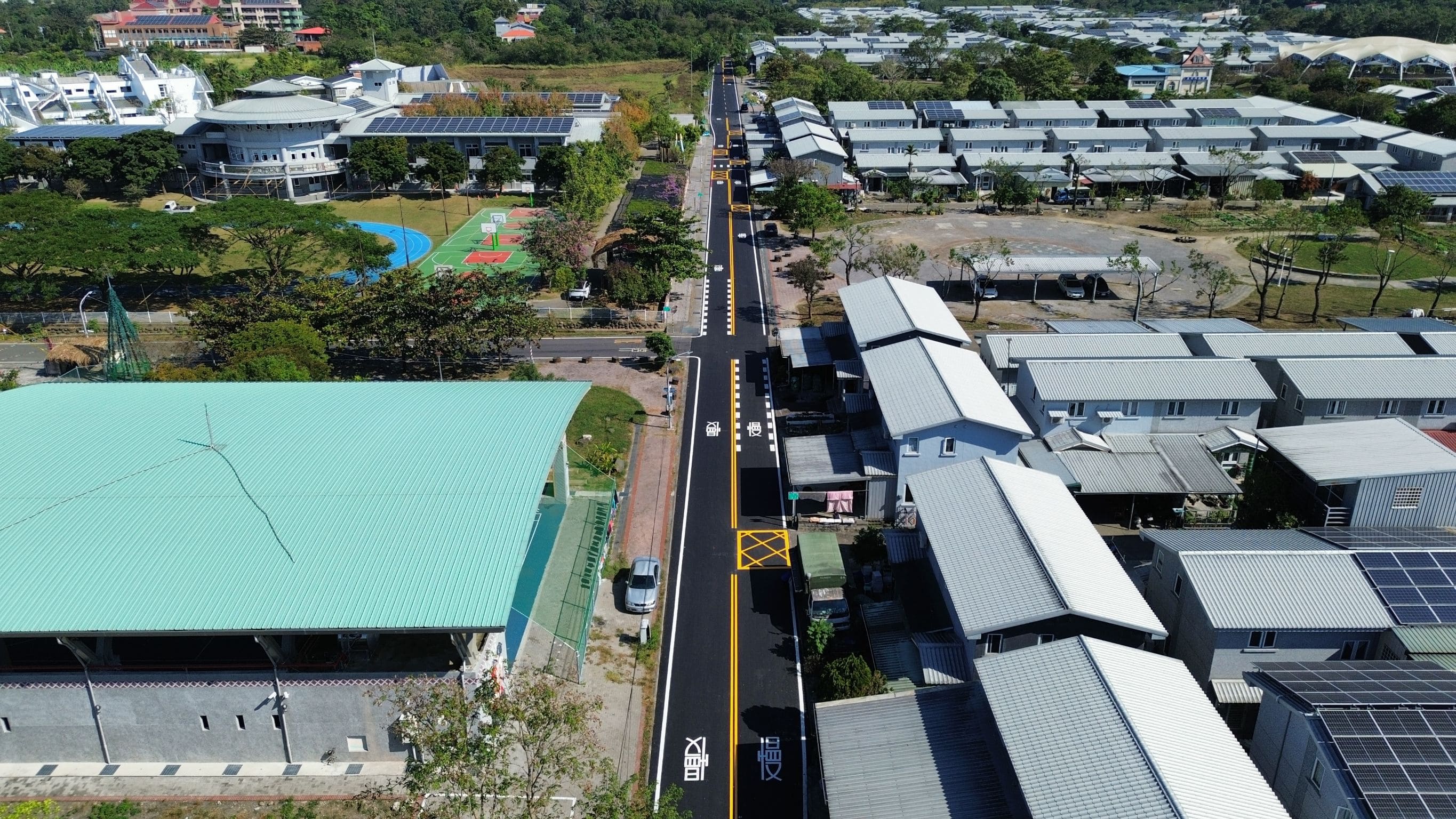 大愛園區為莫拉克風災後建置的永久屋社區,居民匯集多元族群,由於道路使用多年,龜裂老化問題日益明顯,影響行車與行人安全。楊欽富也指出,在人行環境方面,針對園區數處斷續的人行穿越線加以串聯,並於感恩路至憶林街增設新行人通道,使步行動線更完整。同時復舊大愛路杉林國中側標線型人行道,並新增另一側行人設施,配合防撞軟桿與槽化線,引導車流,保障行人與學童通行。