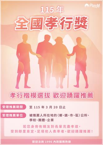 內政部為弘揚孝道倫理,藉以敦風勵俗,並表彰孝行楷模,每年均舉辦全國孝行獎選拔,115年全國孝行獎預定選拔30位孝行楷模,每人將致贈獎座及獎金5萬元,孝行楷模如為低收入戶或中低收入戶,經審議通過者,另致贈孝行獎助金3萬元。
