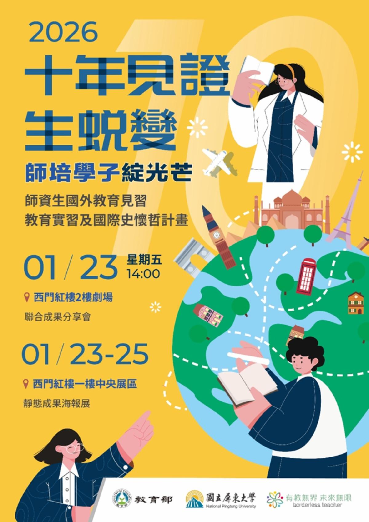 為展現我國師資培育政策於國際交流與多元實踐的推動成果,教育部將於115年1月23日至25日,在臺北西門紅樓舉辦「國外教育見習、教育實習及國際史懷哲計畫聯合成果分享會暨海報展」。本次展覽彙集21校師培大學,共62件、橫跨111至113年度的精彩計畫,透過豐富的成果發表和海報展示,呈現師資生們如何走出臺灣,將教育熱情與專業能力帶到全球不同國家。教育部強調,這些計畫不僅旨在強化師資生的教學專業,更期盼在跨文化情境中培養其溝通協調、問題解決的全球公民素養,具體實踐「教育無界」的理念,提升我國教育軟實力與國際能見度。