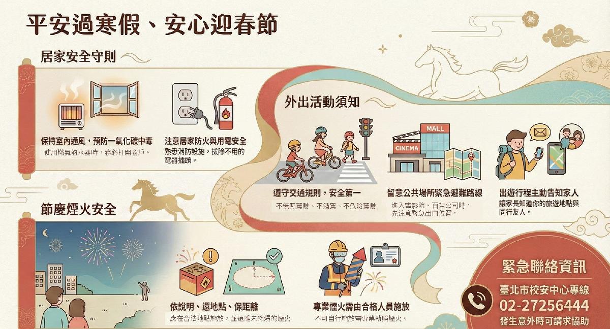 【主題:寒假及春節連續假期,北市教育局提醒師生留意自身安全】