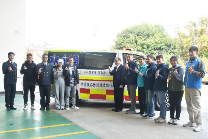 新竹縣竹北市西區緊急醫療能量再升級!在地企業尚崎工程公司董事長謝東毅、陳宥芸伉儷,為回饋鄉里並關懷公共安全,慷慨捐贈新竹縣政府消防局一輛總價值近450萬元的頂級救護車。捐贈儀式23日上午在豐田分隊舉行,由新竹縣副縣長陳見賢代表受贈,並對謝董事長賢伉儷的無私善舉致上最誠摯的謝意。