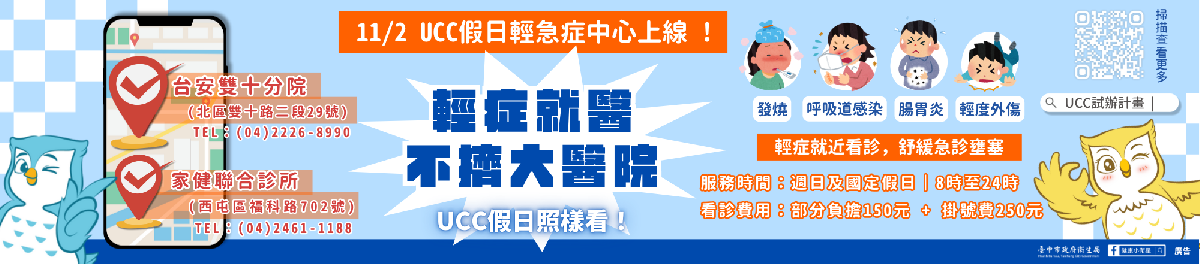 衛生局表示,春節期間常見感冒、腸胃炎、發燒及輕微外傷等輕急症就醫需求增加,為分流急診人潮、確保急重症患者即時獲得照護,台中市設有2處假日輕急症中心(Urgent Care Center, UCC)─台安雙十醫院及家健聯合診所,於春節期間(2月14日至15日、2月17日至20日及2月22日)持續提供門診服務,讓輕急症民眾就近就醫。