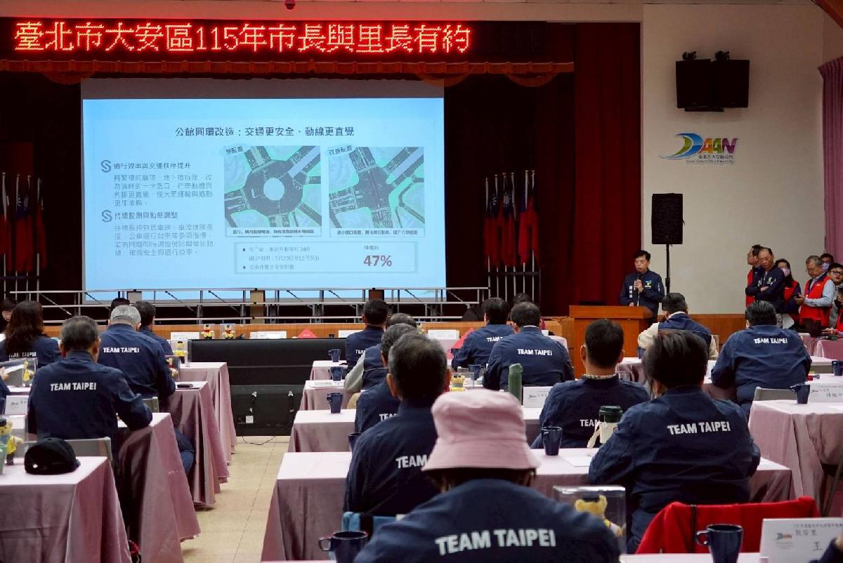 臺北市長蔣萬安今(23)日主持大安區里長有約座談會。致詞時表示,身為市長,最重要的任務之一就是守護每一位市民的安全,因此上任後即全面落實人本交通,從過去以車為本的思維,轉向以人為本的城市治理。他強調,擴大人行空間、讓行人更安全,是進步城市不可逆的重要方向。