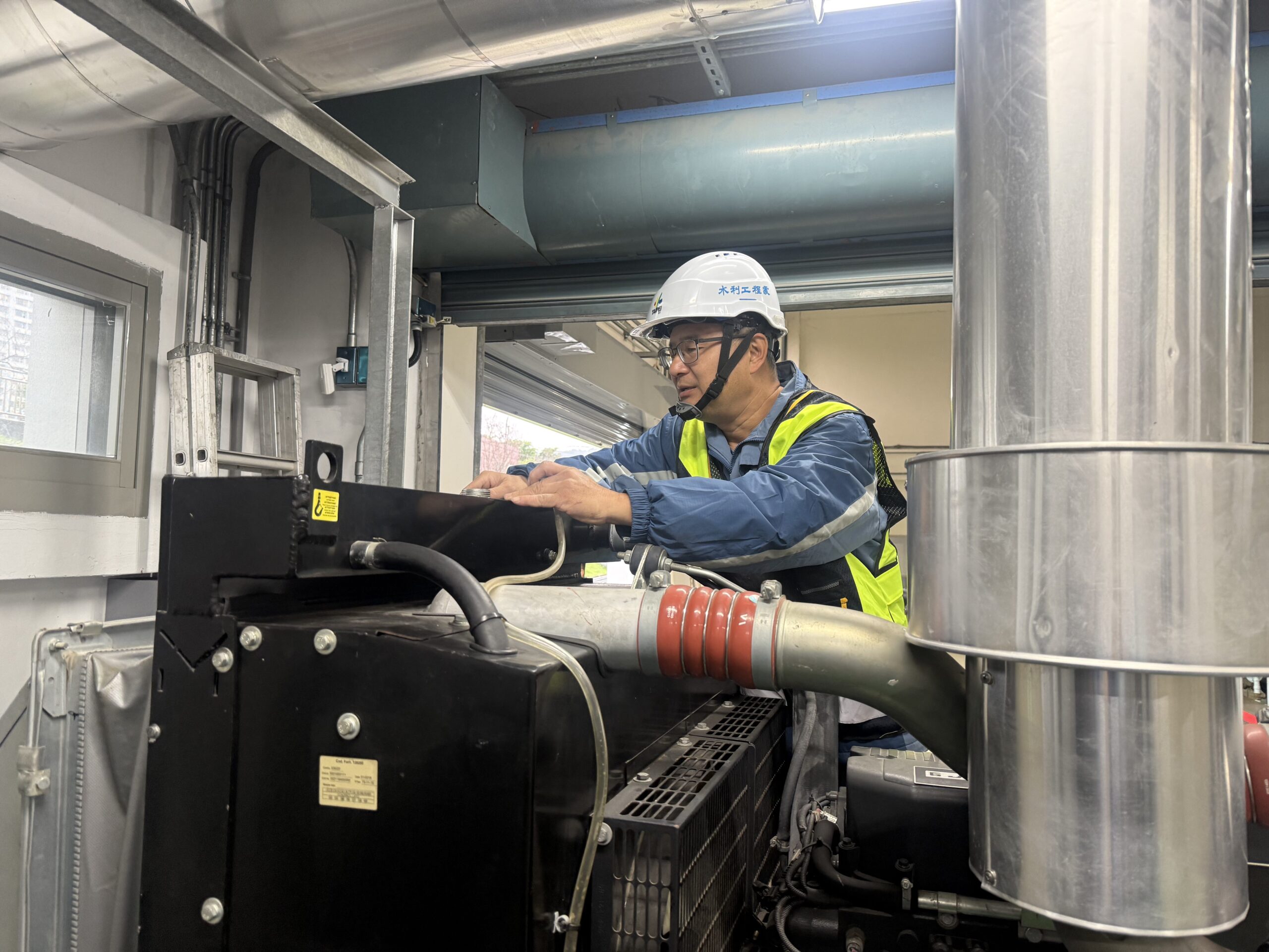 在道南抽水站內,站員攀登至設備上方,仔細檢查備用發電機組水箱水量是否符合安全存量標準。為了維持平衡,他雙腳踩在引擎本體上,一手扶著水箱護蓋,另一手用力轉開因內部壓力而緊鎖的水箱蓋。彆扭的姿勢與額頭滑落的汗水,正是88座抽水站人員日常工作的真實寫照,而這僅僅是每日巡檢作業中的一個片段。