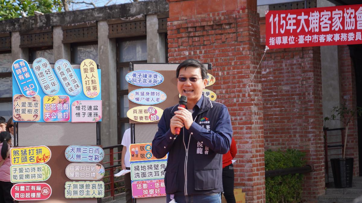 客委會主委江俊龍表示,市長盧秀燕以行動支持客家語言文化,親自主持跨局處會議,推動客語通行,市府客委會致力於客語的傳承與推廣,發掘在地特色,今日上台發表成果的成員,有老幹、有新枝,象徵傳承,更展現關心客家文化、熱心公益的地方人士們恢宏的胸襟氣度,扶植年輕人,讓他們得到鼓舞,市府也訂有客語能力認證獎勵計畫,歡迎市民朋友踴躍報考,領取獎金。