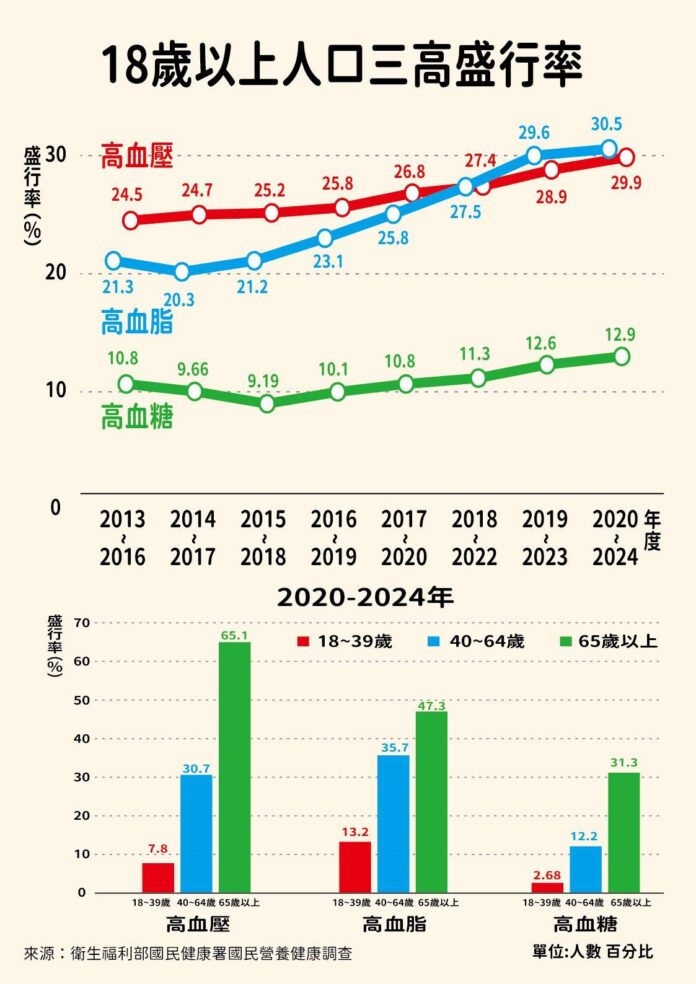 臺北市中正區健康服務中心主任周真貞表示,依據衛生福利部國民健康署114年健康促進統計年報資料,最近一期(109-113年)的國民營養健康調查18歲以上國人的高血壓、高血糖及高血脂等盛行率分別為29.9%12.9%30.5%,且數據顯示近年來三高盛行率持續增加。國人外食比例接近7成,由於外食族群常面臨食物種類選擇限制,過多的油、鹽攝取,進而增加三高及心血管疾病等健康風險。