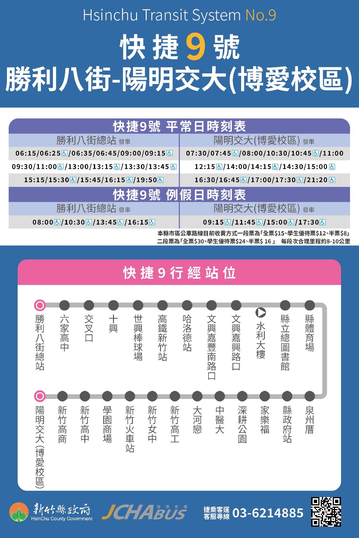 快捷9號串聯新竹縣竹北市及新竹市生活圈,沿途停靠雙鐵及多所學校,路線將於2月1日起正式營運,除原有平日33班次,再增加假日往返共8班次(往返各4班次),皆以無障礙車輛行駛,以利各使用族群於不同時段使用。縣長楊文科強調,快捷9號營運至今搭乘人數成長6.5倍,增加班次提供更完善服務,歡迎民眾多加利用搭乘。