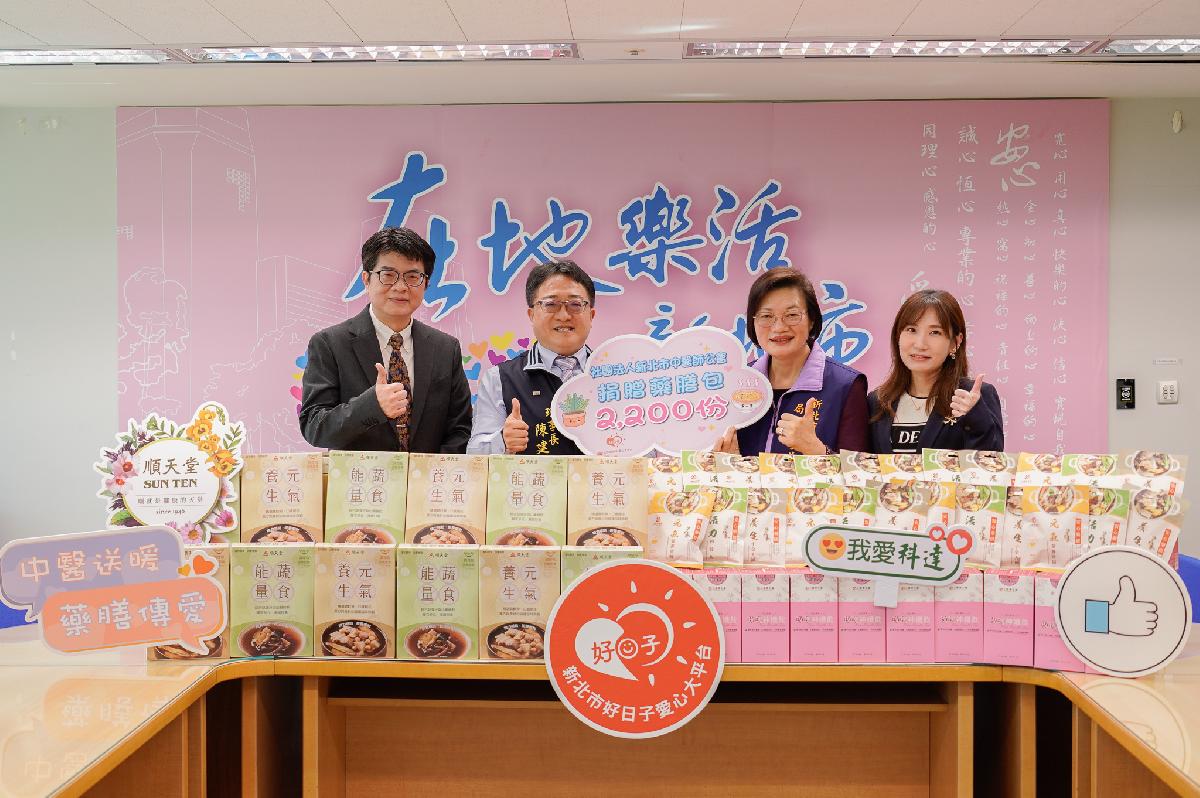 社團法人新北市中醫師公會29日結合科達製藥公司及順天堂藥廠,捐贈2,200份的藥膳包,包含養生十全大補湯及玫瑰神孅飲等。這是公會從106年起每年持續的善舉,至今已累計捐贈超過萬包,市值合計220萬元。社會局長李美珍代表侯友宜市長回贈感謝牌,並感謝公會及兩家藥廠持續不斷的送愛,讓弱勢家戶暖胃又暖心。