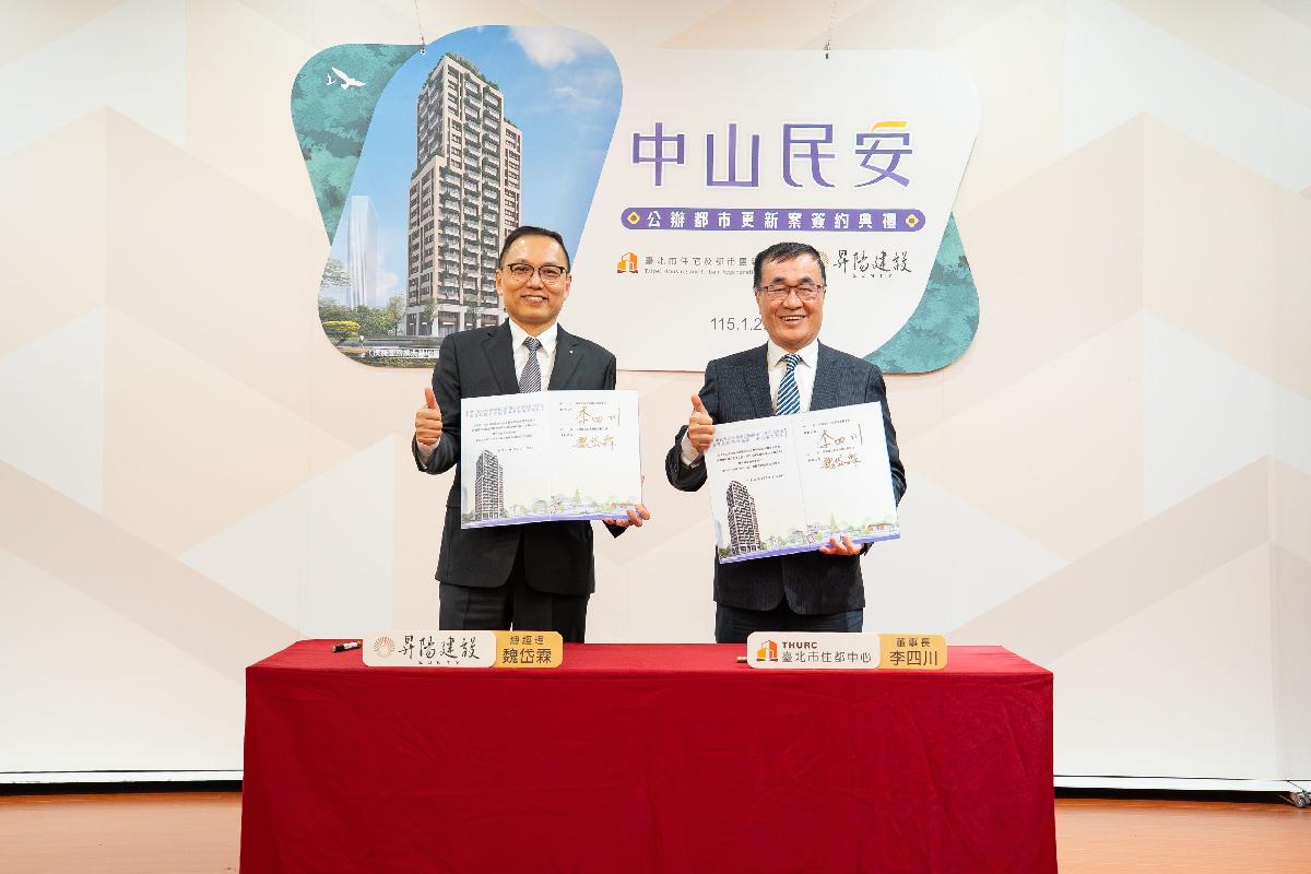 臺北市政府財政局主導並由臺北市住宅及都市更新中心(以下簡稱臺北住都中心)擔任實施者辦理之「臺北市中山區中山段四小段479地號等7筆土地公辦都市更新案」,與出資者昇陽建設企業股份有限公司(以下簡稱出資人)於今(1/29)日舉辦隆重簽約典禮,象徵本案正式啟動,透過公私協力活化市有土地,為本府主導都市更新再添重要里程碑。