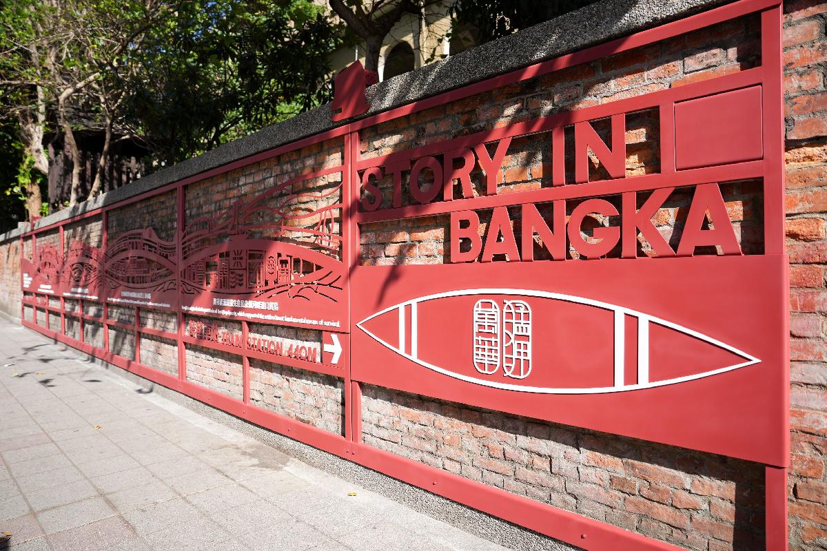 來到老松國小康定路側「萬華故事牆」,以萬華產業故事為主軸,結合運用現代設計手法及材質轉化,將萬華從清代港口、市集發展到近代城市的產業變遷歷史巧妙編織於牆面意象中,整體視覺串聯河岸、鐵路及市集等關鍵元素,透過形塑一條可閱讀的街區敘事軸線,使原本僅作通行之街角空間,搖身一變成為引導觀光客閱讀理解街區故事的「城市藝廊」,提升步行體驗的層次感。