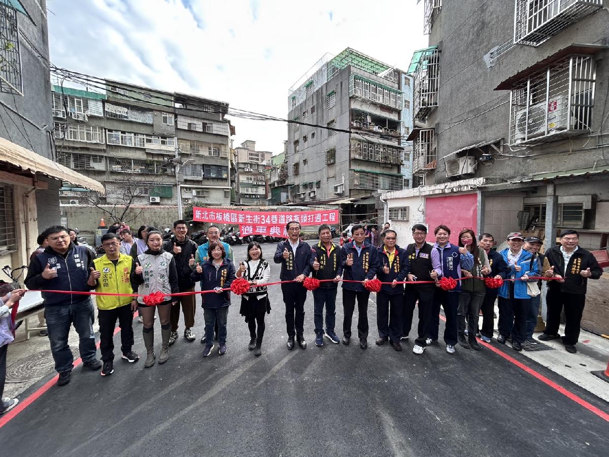 板橋區新生街34巷道路瓶頸打通工程,全長約30公尺,於1月30日完工通車。瓶頸路段打通後,新生街34巷得以串聯新生街及金華街,用路人無須再繞道行駛,可有效縮短行車時間,提供民眾更加順暢、便利的交通環境。