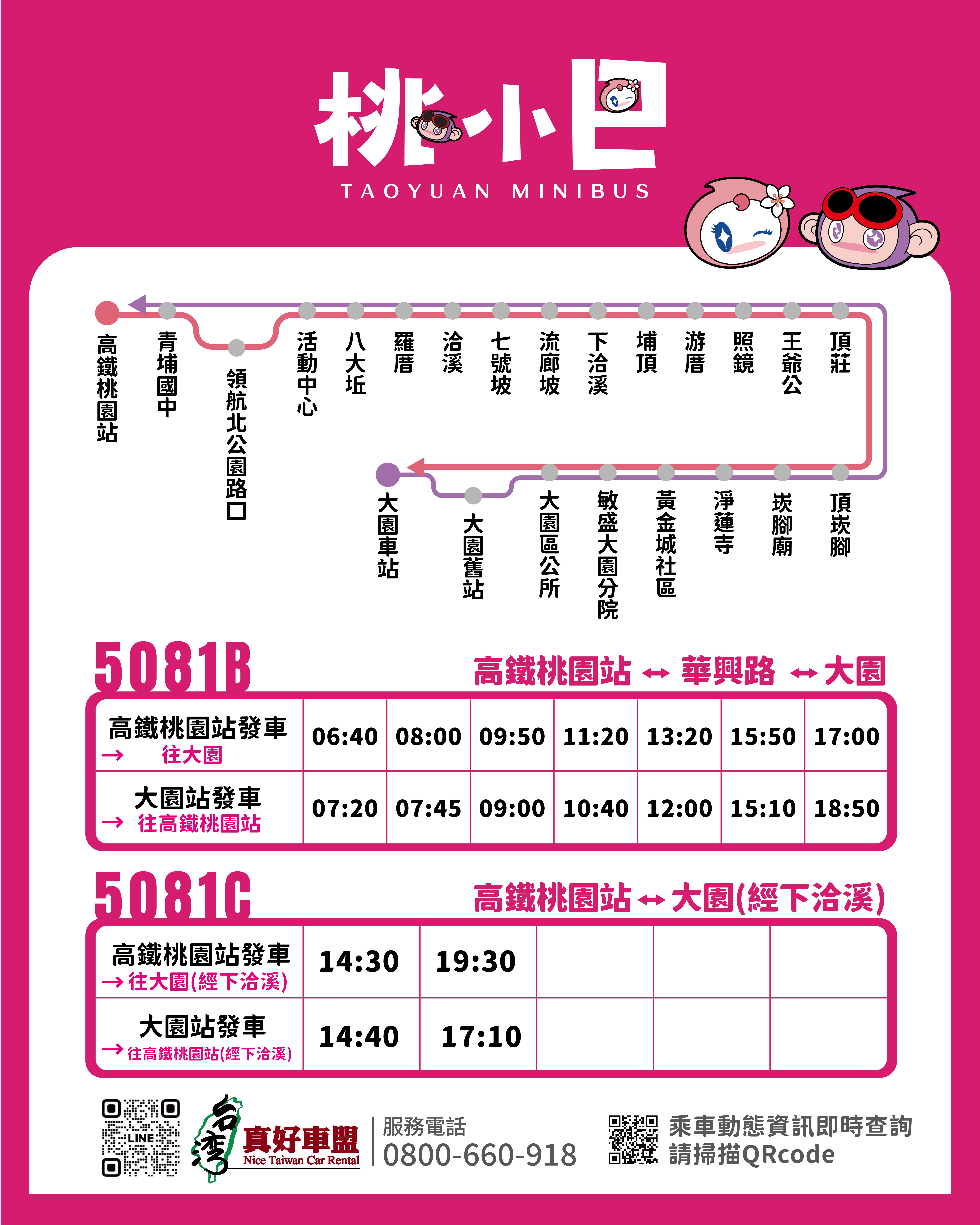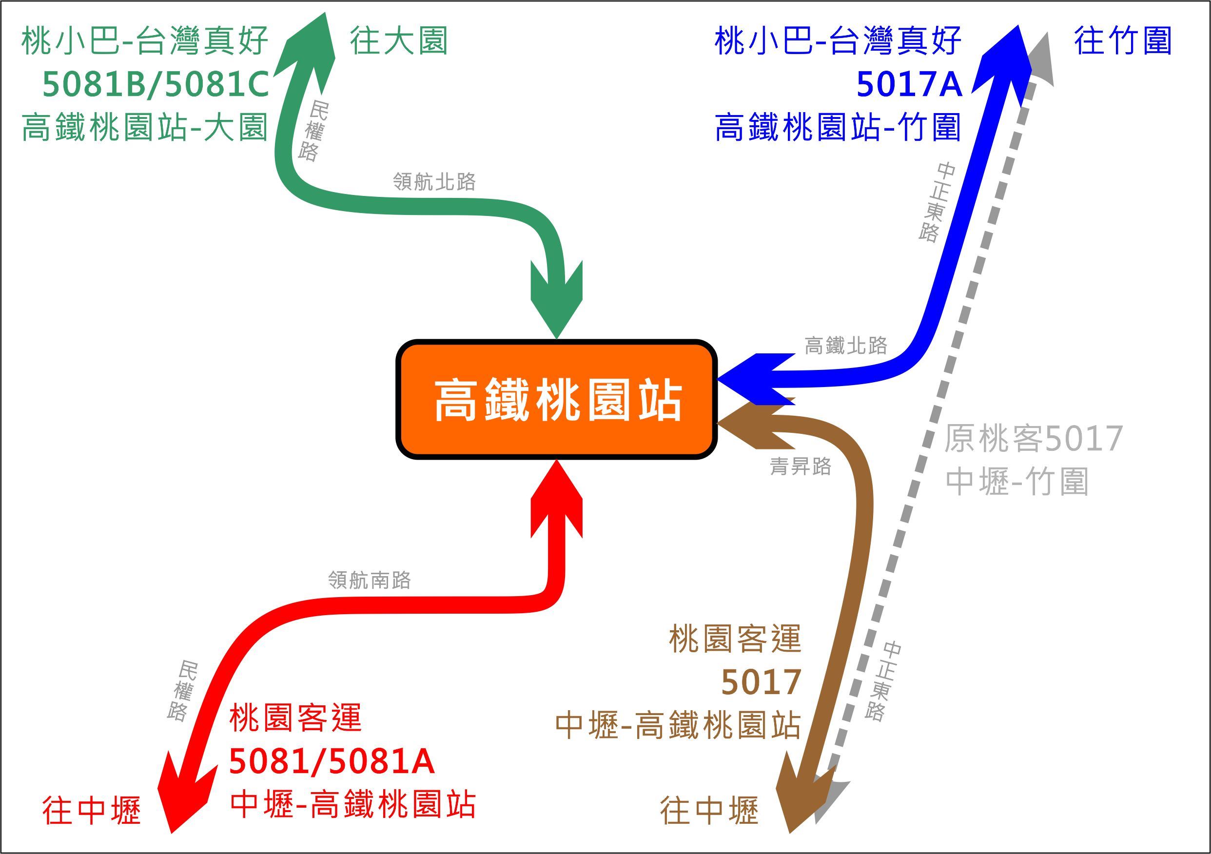 市區公車5081、5081A及5017等三條路線則是將部分區間路段轉型為九人座桃小巴路線服務。5081、5081A及5017路線維持由桃園客運服務「中壢總站」往返「高鐵桃園站」區間,並維持既有市區客運收費費率且享有市民卡乘車優惠。「高鐵桃園站」往返「大園」區間則是由桃小巴營運業者台灣真好公司營運之5081B、5081C路線,以及營運「高鐵桃園站」往返「竹圍」區間之5017A路線。5081B、5081C、5017A等三條桃小巴路線,搭乘民眾使用「桃園市民卡」刷卡即可享有免費乘車優惠。