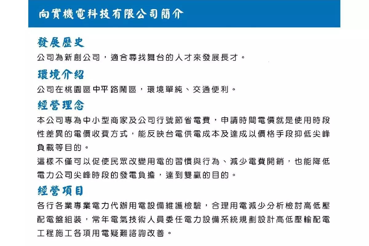 向實機電科技是一家位於桃園區中平路上的新興節能產業,專注於為中小型商家及公司提供電力管理服務,以節省電費支出。我們的經營理念是透過申請時間電價的方式,讓客戶能夠在不同時段享有不同的電價收費,以反映台電供電成本,同時達到抑低尖峰負載的目的。