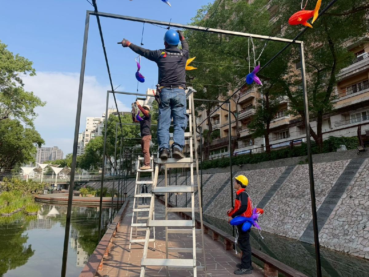 眾所期待的2026年新莊中港大排光雕展正如火如荼進行布展。為帶給市民最震撼的視覺饗宴,工程人員也加緊腳步安裝燈飾與測試。新北市政府水利局提醒,河廊布展期間,請遊客休憩散步時務必注意自身安全,並配合現場導引。