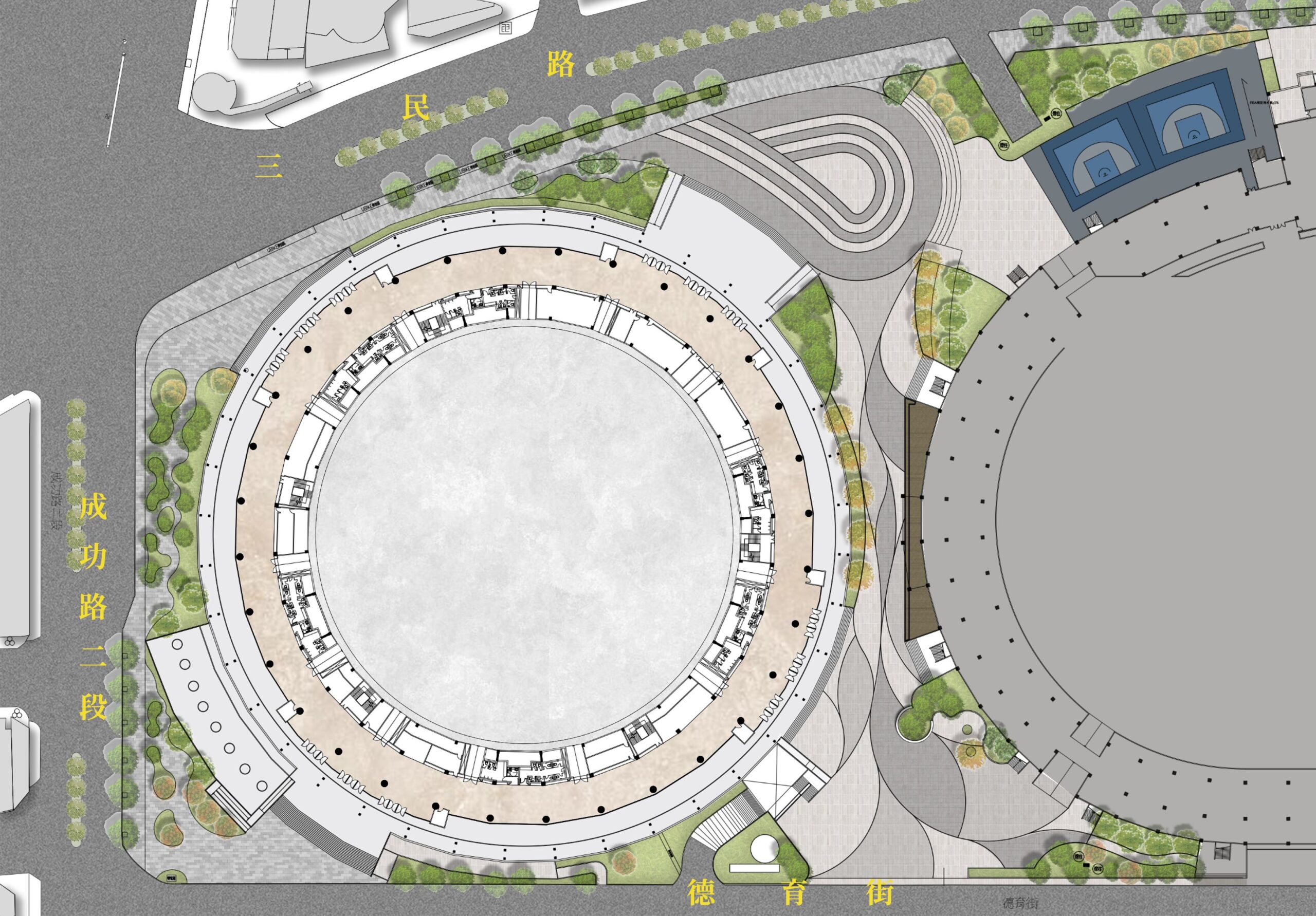 工程涵蓋三大項目,包含成功路段及周邊景觀改善、中央廣場改造、三對三籃球場整建與周邊景觀提升。透過環狀景觀調整、步行空間優化、友善綠帶打造與開放式運動空間更新,不僅提升場館外部使用機能,也將串聯舊城區至虎頭山的綠色人本走廊,營造更安全友善的街道環境。