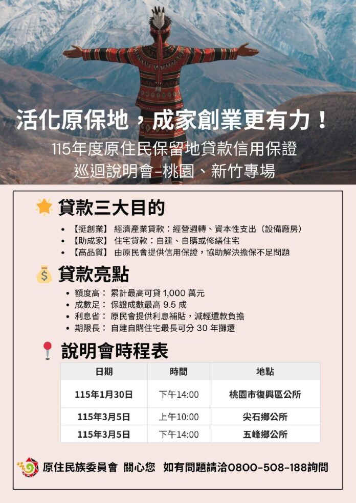 此外,原民會規劃全國辦理22場「原住民保留地貸款信用保證業務」政策說明會,其中新竹縣將於3月5日上午10時在尖石鄉公所辦理;同日下午2時,在五峰鄉公所辦理,歡迎族人踴躍參加,現場將由專人說明申辦流程,並提供諮詢服務。