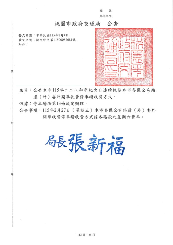 北部新聞桃園市公告本市115年二二八和平紀念日連續假期本市各區公有路邊(外)委外開單收費停車場收費方式。 北部新聞桃園市 公告本市115年二二八和平紀念日連續假期本市各區公有路邊(外)委外開單收費停車場收費方式。 編輯 張 芊芊 2026-02-04 1.名稱:公告本市115年二二八和平紀念日連續假期本市各區公有路邊(外)委外開單收費停車場收費方式。 2.時間:115年2月27日(星期五) 3.地點:全桃園市 4.內容:115年2月27日(星期五)本市各區公有路邊(外)委外開單收費停車場收費方式採各路段之星期六費率進行收費。 延伸閱讀 商情 移民留學文件不能出錯!專業翻譯社解析為何文件翻譯與公證認證影響成敗關鍵 商情 正道藏心茶葉蛋–南投必吃茶葉蛋、埔里藏心蛋宅配、無蛋黃茶葉蛋 商情 頂好防水防熱工程材料行–宜蘭防水抓漏、宜蘭屋頂防水、外牆防水 商情 啟思工業–台中南區電動吊車專賣、台中天車工程、台中拖板車首選