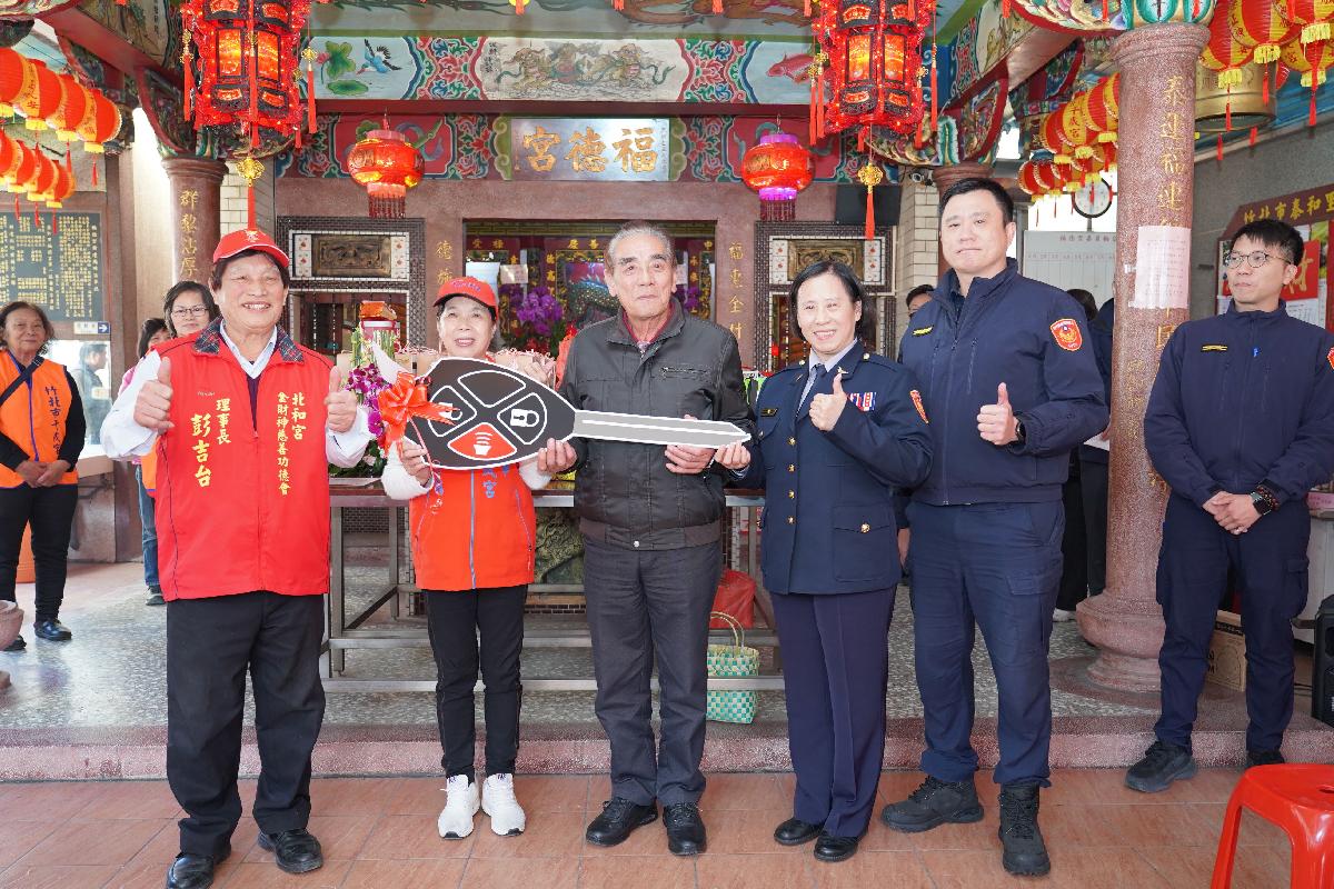 千歲宮一早鑼鼓喧天、熱鬧滾滾,與會來賓和信眾虔誠向福德正神上香祈福後,徐副縣長接下千歲宮林秀蘭主委及新竹縣金財神慈善功德會彭吉台主委捐贈的大型車鑰匙,轉交給新竹縣警察局副局長邱幼媚及竹北分局長吳學安,徐副縣長並回贈感謝狀,感謝協助提昇員警執勤安全,強化打擊犯罪的善行義舉,展現地方團體對治安工作的支持與肯定。