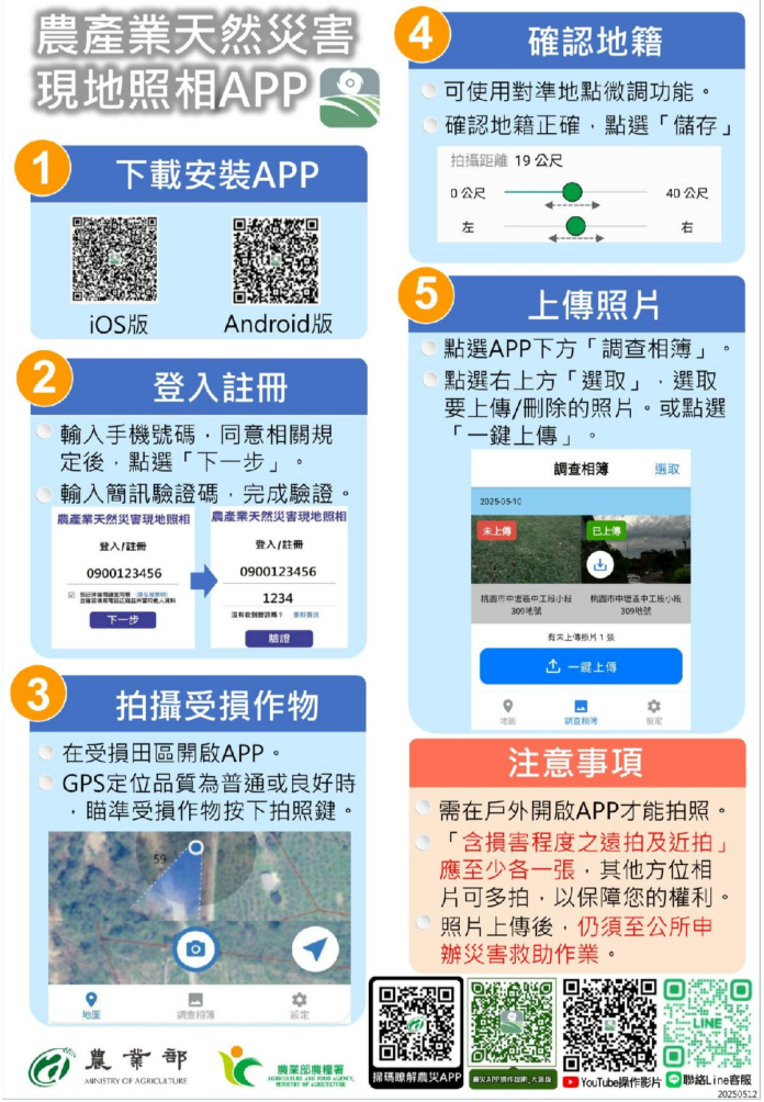 農業局指出,目前已通報各區公所密切注意並宣導相關防範措施,後續倘有災情顯現,亦請農友主動向當地公所通報,並請依農業天然災害查報作業規定辦理。另外,公所對於災後需即時採收及復耕之受災田區作物,應動員人力進行勘查及拍照取證工作,並加強宣導農友可自行拍攝當次災害損失照片,內容應包含拍攝日期、災損情形、相鄰田區、可識別田區位置之背景及衛星定位資訊,並自行標示田區坐落地段及地號等。農業部已開發具有定位功能的「農產業天然災害現地照相APP」,讓農民拍攝當次災害之災損照片作為佐證文件,協助基層公所保存作物受損證據,可多加利用。後續如經公告辦理救助,應於公告受理申請救助期間內,併同申請文件送基層公所備查,作為災損認定之佐證參考資料,兼顧受災農民即時復耕與申請農業天然災害救助之權益。