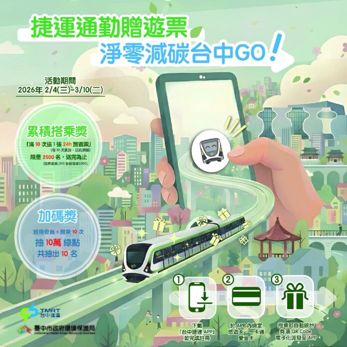 為鼓勵市民於日常通勤落實節能減碳,台中捷運公司攜手台中市政府環保局日前共同推出「捷運綠動,減碳啟動」活動,將送出24小時旅遊票,再抽10萬點綠點。中捷公司表示,只要下載台中捷運APP、綁定電子票證並完成搭乘任務,就能參加活動,搭捷運的同時也為地球永續盡一份心力。