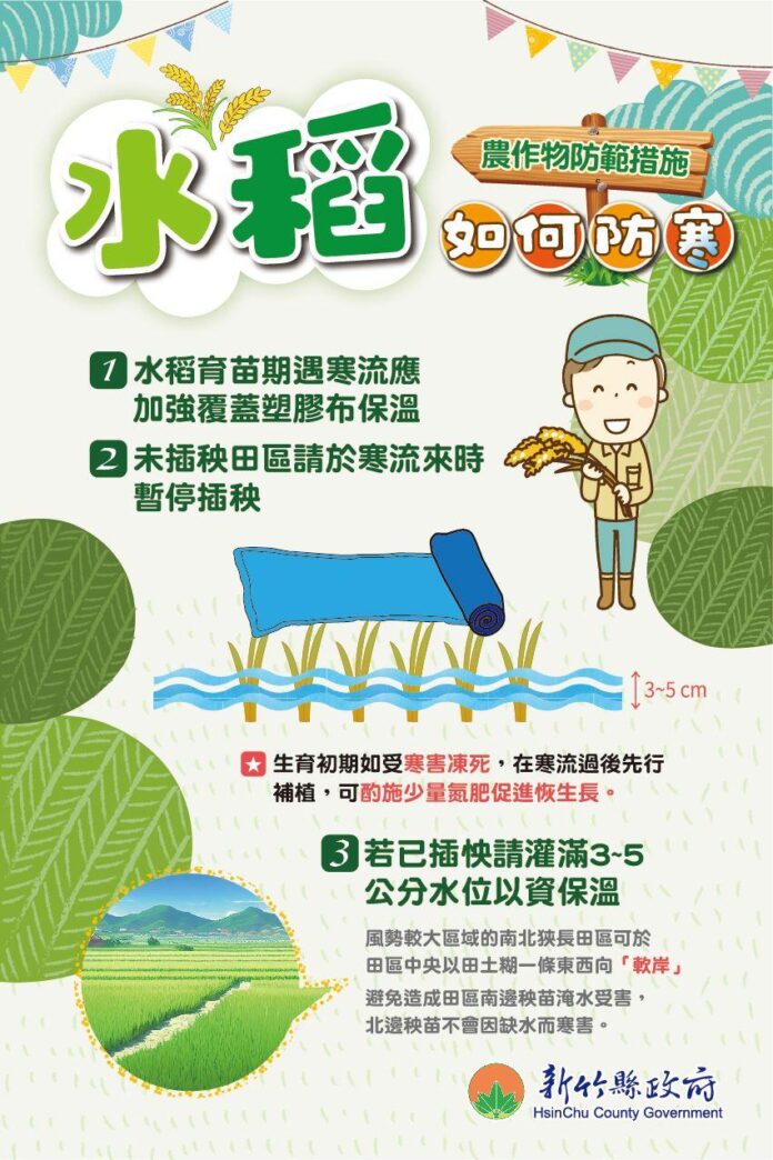 包含水稻育苗場(圃)選擇避風處或設置防寒(風)牆,在冷氣團來臨時,可利用不織布、塑膠布覆蓋已綠化中或生育初期的秧苗,並隨時清除布上積水,以防低溫凍傷,冷氣團離境後宜立即掀開塑膠布。