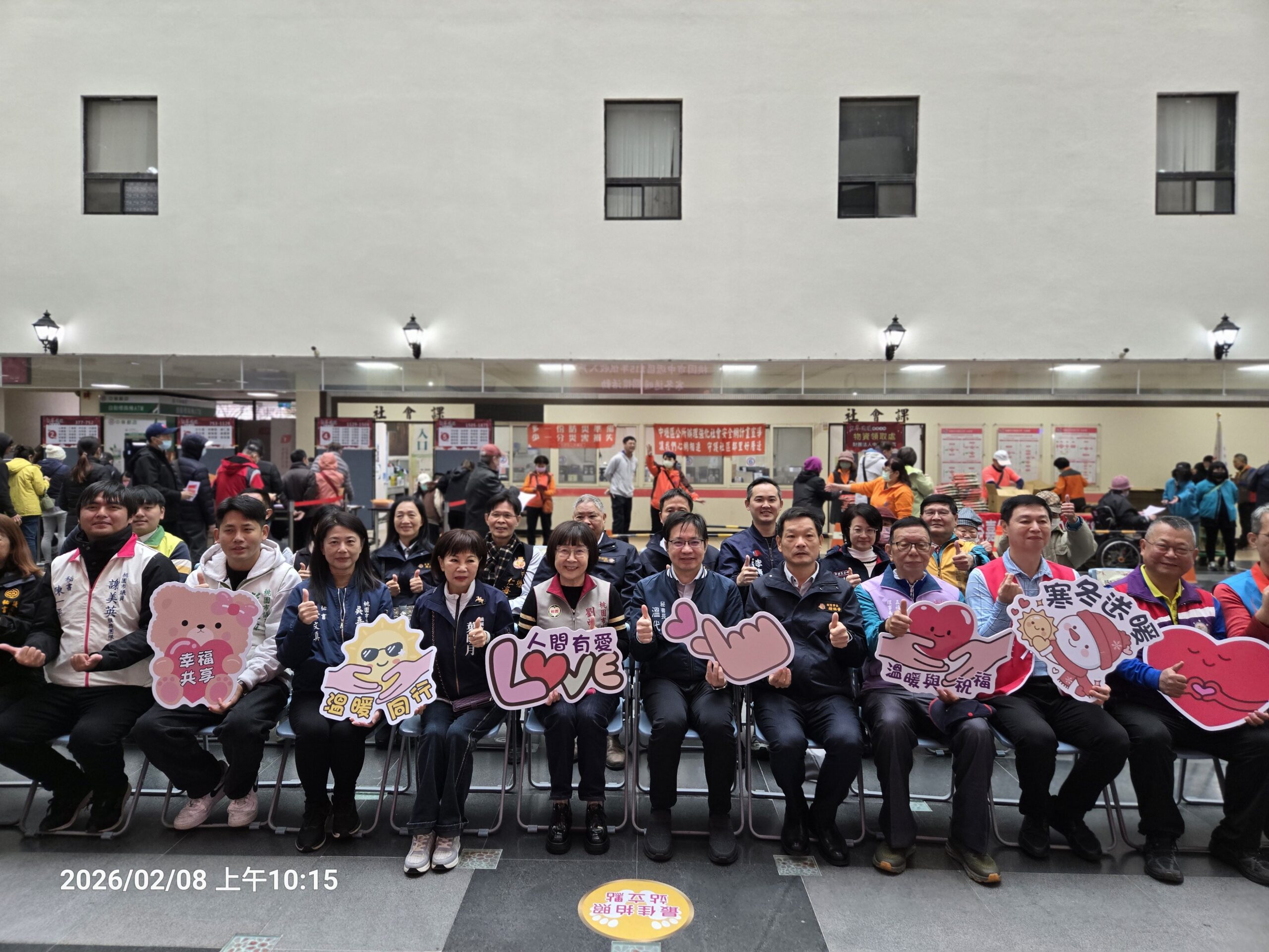 為關懷弱勢族群,在歲末寒冬農曆春節前夕,中壢區公所2月8日(星期日)於公所1樓中庭舉辦「115年桃園市中壢區低收入戶寒冬送暖關懷活動」,本次關懷活動除了公所提供每戶300元禮券,亦有仁海宮贊助發放每戶新臺幣2,000元禮券、平安米1份、大和建設機構捐助物資、五福社區發展協會捐助餐點及桃園市蔬菜批發從業人員職業工會捐贈蔬果等愛心團體贊助,另外救國團桃園市工青四隊號召23位志工亦以實際行動共同協助本活動。