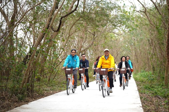楊文科表示,新竹縣的自行車道路網四通八達,新竹縣政府自110年向交通部公路局爭取補助辦理「雙新自行車道」計畫,陸續打通新竹縣濱海南北軸線,雙新自行車道可與桃園市新屋串聯,向南延伸新豐鄉濱海自行車道,銜接紅毛港遊憩區經鳳坑沙灣至台15線鳳鼻隧道旁自行車專用道,並經過竹北原森林路段轉往尚海灘與新月沙灣後至竹北水月意象景觀橋,帶動觀光發展。