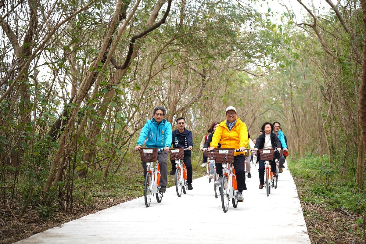 新竹縣頭前溪右岸自行車道於今天(9日)正式通車,新竹縣長楊文科邀交通部公路局北區養護工程分局長謝俊雄、經濟部水利署第二河川分署長楊人傑,及多名新竹縣議員,共同剪彩象徵啟用,並騎乘一小段,體驗合歡合抱的小徑「銀合隧道」、欣賞豆腐岩,感受頭前溪右岸自行車道的魅力。