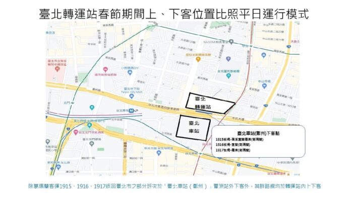 臺北轉運站進駐客運路線於農曆春節連假期間,除葛瑪蘭客運由宜蘭、羅東、礁溪返抵臺北之1915、1916及1917路線部分班次仍維持於「臺北車站(鄭州) 」站外下客(位置如附圖)外,其餘各路線均於轉運站內上、下客;為確保轉運站運作順暢,臺北市公運處已要求客運業者及轉運站增派服務人員協助疏運,並協調於轉運站周邊重要路口加派義交指揮,客運業者亦將配合於尖峰時段增開班次,使旅客得以順利返鄉。
