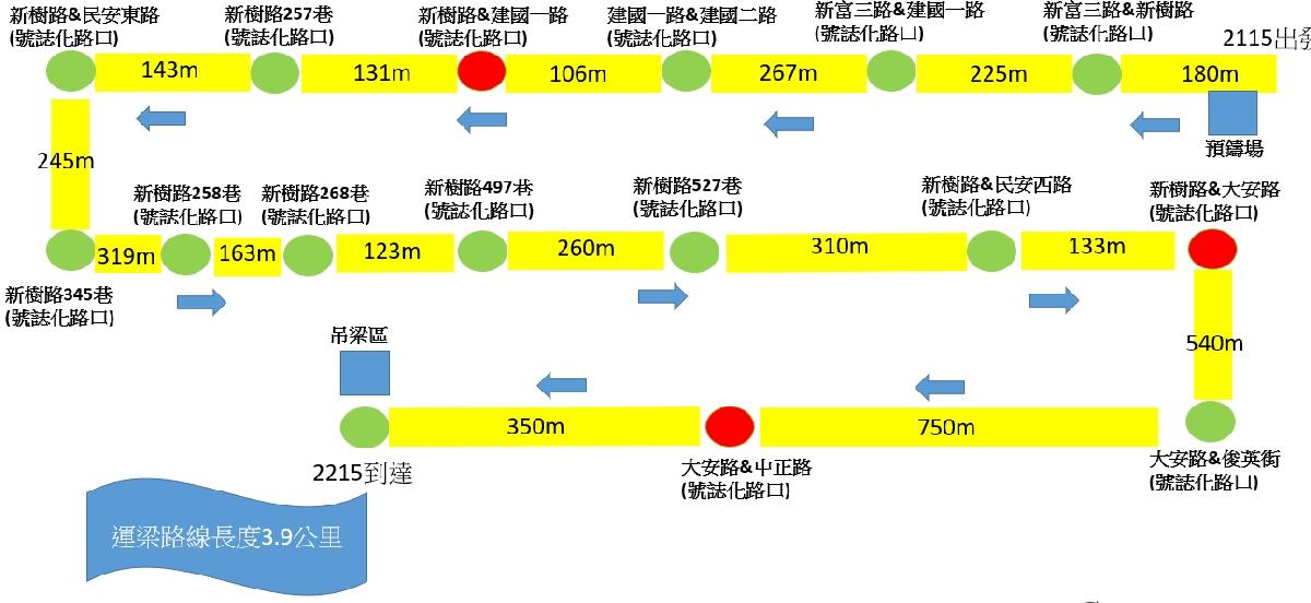 預鑄U型梁運送路線:新莊區新富三路與新樹路交口(預鑄梁場)-新富三路-建國一路-新樹路-樹林區大安路,通過各路口以不封路方式通過,以義交人員臨時阻擋車輛禁止通行,待運梁車通過後,再開放車輛通行(圖1)。