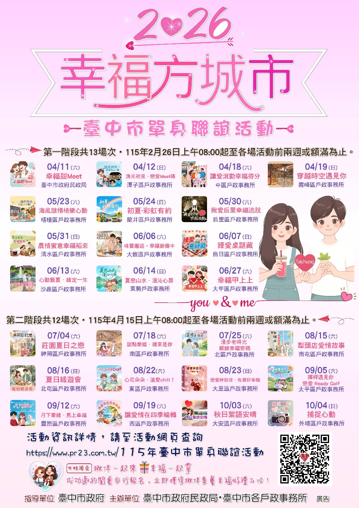 民政局說明,台中市115年單身聯誼活動分二階段開放網路報名,第一階段開放13場次,將於2月26日上午8時起開放報名;第二階段則有12場次,並自4月15日上午8時起開放,每人酌收報名費500元,每場次報名均至額滿為止;另女性揪伴一起報名成功,還可獲贈精美小禮,歡迎單身民眾選擇適合自己的年齡、興趣場次報名參加,報名詳情請至活動專屬網站( https://www.pr23.com.tw/115年臺中市單身聯誼活動 )查詢。