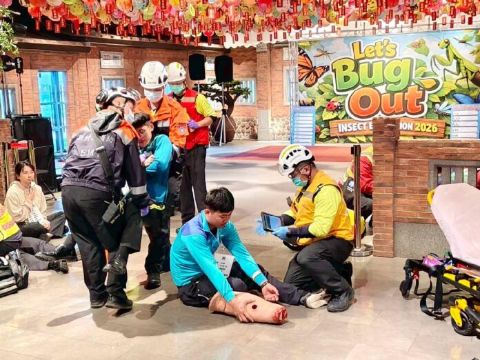 春節將至,人潮聚集場所安全備受關注。新竹縣政府消防局今(12日)下午3時特別於竹北大遠百辦理「大量傷病患情境演練」,模擬春節期間商場人潮眾多時,突發隨機持刀攻擊事件,造成民眾小腿截斷、開放性氣胸及呼吸困難等重大傷勢,全面檢視第一線救護與指揮應變能力。