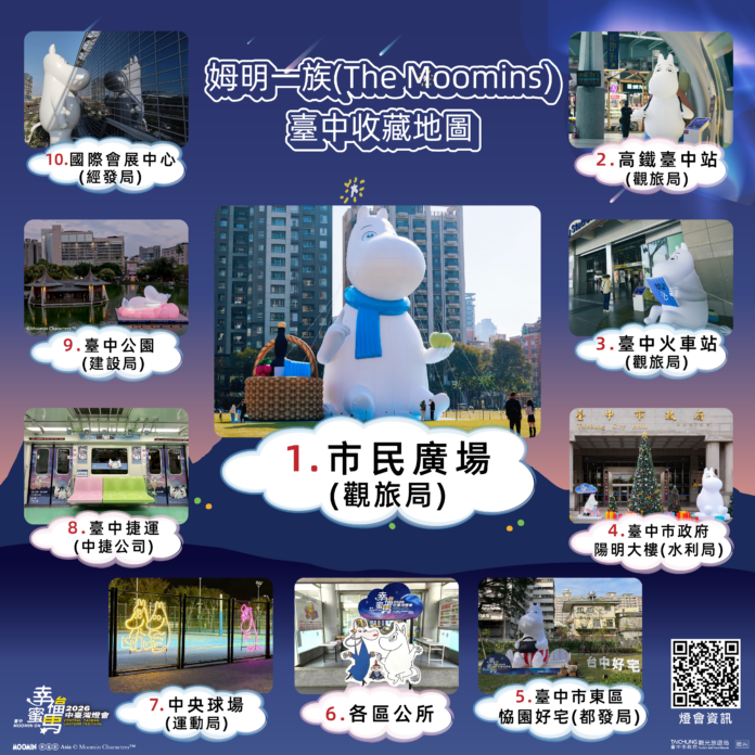 想來趟都會小旅行的朋友,特別推薦到台中收藏「姆明一族(The Moomins)」的可愛身影,除了「台中市民廣場」21公尺高、全台最大的巨型姆明,「台中國際會展中心」、「台中公園」、「東區恊園好宅」、「中央球場」及高鐵台中站、火車站、台中捷運也都有姆明一族驚喜現身,還可順遊美學新地標「台中綠美圖」及國內規模最大的「逢甲夜市」,一起甜蜜過馬年、熱鬧迎新春!