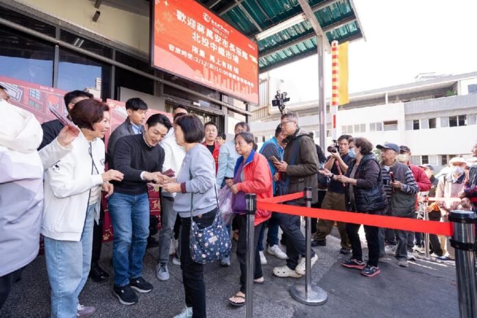 農曆春節將至,公有北投中繼市場的年節採買人氣逐漸熱絡,今(2/12)日蔣萬安市長也親至現場向攤商與民眾拜年發放發財金,並造訪北投齊雞及阿玉素食等名攤,透過多樣食材及食材對應的吉祥話,如果凍雞對應大吉(雞)大利、滷味對應福祿(滷)壽、糕點對應步步高(糕)升,祝賀攤商生意興隆、歡喜過好年,展現北投市場獨特且豐富的年節氛圍。
