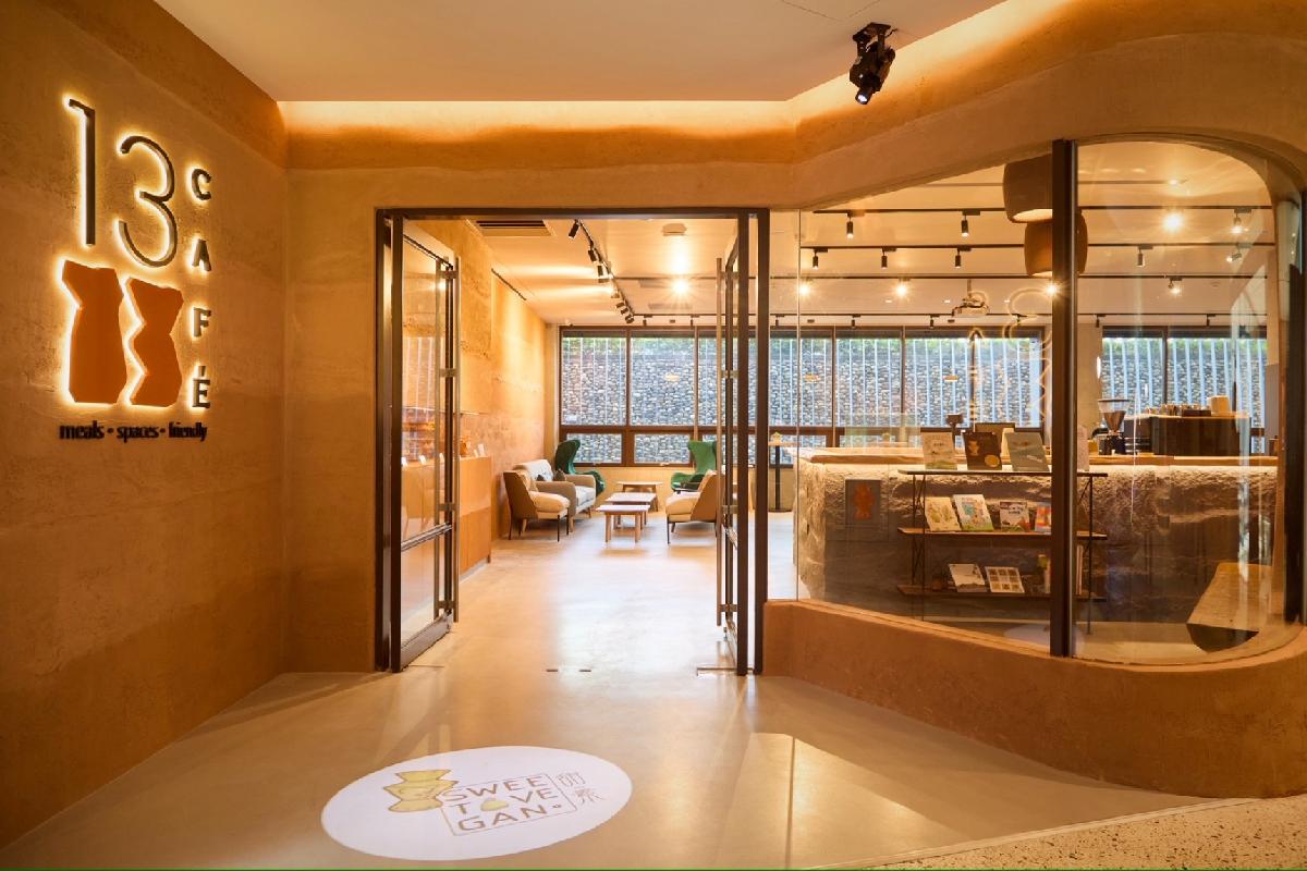 「13 CAFÉ」前期由「新北市設計中心」操刀品牌識別,將博物館標誌性的清水混凝土與灰色幾何線條,揉合考古文物的陶土橘與有機肌理,為品牌注入獨特的視覺個性。接續的場域營造緊扣「文化沉積X在地永續」核心理念,讓空間本身即是對土地與時間的回應。為了提供民眾最安心的休憩環境,館方在施工過程中嚴格控管建材履歷,並經由第三方驗證,最終在綠裝修認證榮獲「黃金級」。咖啡廳牆面選用苗栗黃土與桃園紅土,混入文蛤殼與陶片,手工鏝抹出彷彿地層般的沈積紋理;活動家具則引入「REWOOD湖口創生」團隊的循環修枝木工藝,將林業剩餘資源轉化為溫潤的桌椅。這些看不見的細節,在冬日裡構築出一處既能感受歷史沉積,又能真正大口深呼吸的安心場域。
