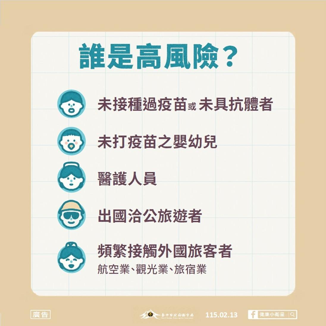 台中市政府衛生局今(13)日接獲疾病管制署通知,新增一名境外移入麻疹確診者,為台中市115年首例境外移入麻疹確診案,該個案可傳染期無公共場域活動足跡,初步匡列接觸者48人,市府衛生局將持續健康追蹤,全案預計監測至3月4日止。
