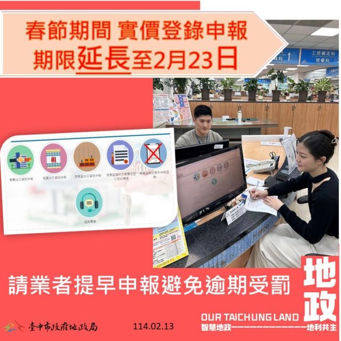 地政局長曾國鈞表示,建設公司、不動產代銷經紀業、不動產仲介經紀業及包租業者,應於簽訂預售屋買賣(解約)契約或租賃(轉租)契約書之日起30日內,透過內政部地政司「不動產成交及預售屋備查資訊申報網」(https://vlir.land.moi.gov.tw/)完成實價登錄申報。若30日期限末日遇國定假日,依法順延至次一上班日辦理。因部分案件期限適逢春節連假,依法可順延至2月23日前完成申報,但仍建議民眾與業者儘早辦理,避免逾期受罰。