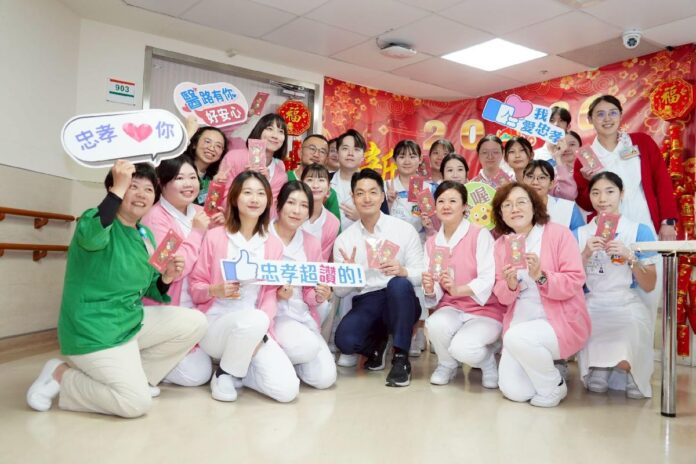 臺北市長蔣萬安今(13)日於春節前夕,前往臺北市立聯合醫院忠孝院區慰勞醫護人員,發送紅包給忠孝院區各單位同仁,並與護理站機器人互動、與大家合影留念。